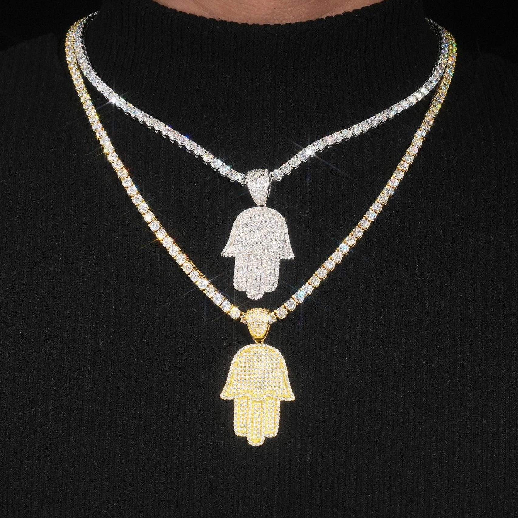 Renowned for its power to attract happiness, luck, health, and prosperity, this Hamsa pendant features dazzling VVS1 moissanite stones that deliver unmatched brilliance.